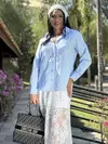 A camisa listrada Samara traz o equilíbrio perfeito entre o clássico e o moderno. Com padronagem vertical em azul claro e branco, ela alonga a silhueta e traz leveza para o visual. O tecido em poliéster tem caimento leve e toque macio, garantindo conforto ao longo do dia com praticidade, já que quase não amassa.