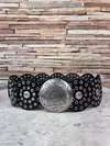 O cinto boho western é aquele acessório que transforma qualquer look com um toque autêntico e cheio de personalidade. Com um design imponente, ele traz detalhes de ilhós metálicos e aplicações em alto relevo, criando um efeito marcante e sofisticado.