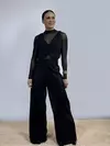 O colete estruturado, com ziper frontal e corte acinturado, realça a silhueta com um toque refinado e fashion-forward. Já a calça wide leg de cintura alta alonga a silhueta, garantindo fluidez e movimento para um visual marcante.