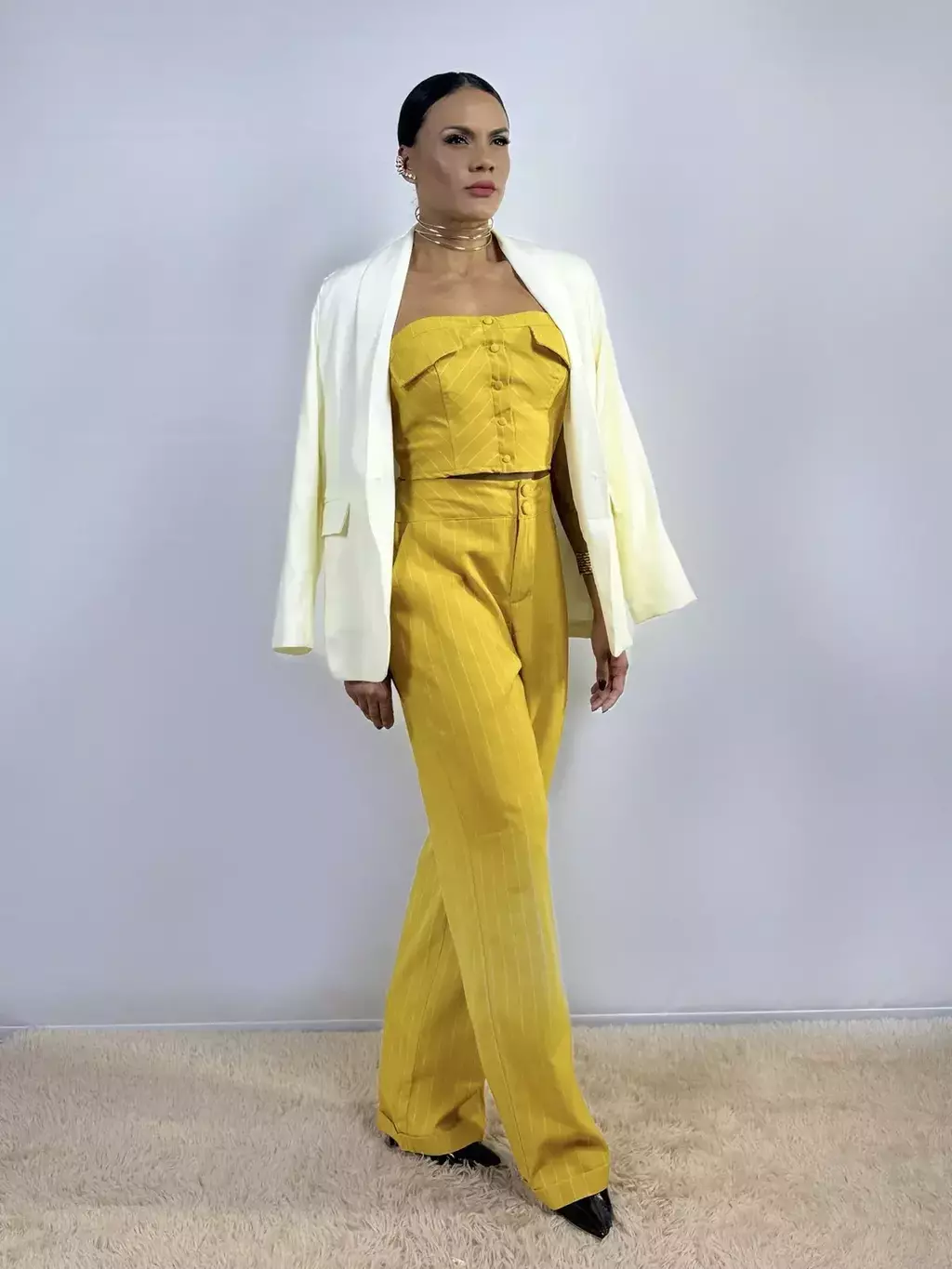 Poder e sofisticação em um só look! Este conjunto é a definição de um visual moderno e imponente, unindo um cropped estruturado com botões e detalhe de pregas a uma calça de alfaiataria listrada de caimento impecável.
