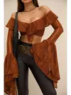 Um ícone do estilo boho chic, o Cropped de Renda Boho Luxe une sensualidade elegante com o romantismo da renda trabalhada. A modelagem ombro a ombro valoriza o colo com charme e sofisticação, enquanto as mangas longas com babados dramáticos garantem movimento e presença em qualquer ocasião.