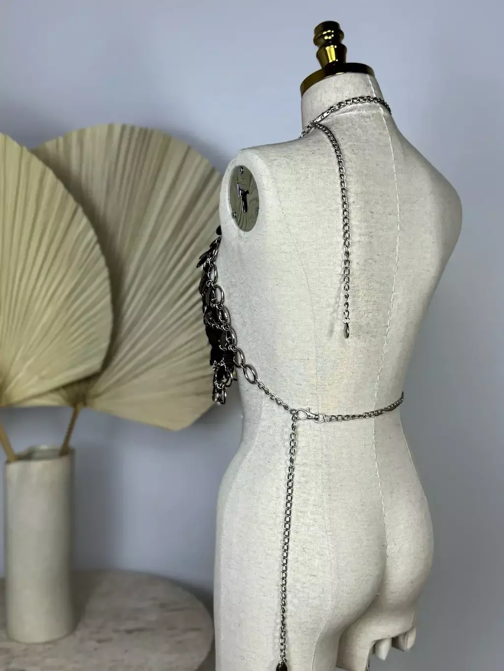 Composto por discos metálicos pretos interligados por argolas prateadas, o Nyx combina sensualidade, movimento e atitude. O caimento estruturado cria um visual moderno, fashionista e com presença — perfeito para quem ama se destacar.